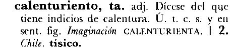 En definitiva, la acepción lúbrica del adjetivo calenturiento (N°3) no es más que la incorporación en el DRAE en su versión del 2001 de una implicación lúbrica y reciente en España. Una de tantas cosillas que se manda la RAE cuando incorpora españolismos (muy bien) sin decir que son españolismos (muy mal). La versión del DRAE anterior, la de 1991, contenía sólo esto: http://forums.tomisimo.org/picture.p...&pictureid=710 lo cual no descarta las interpretaciones lúbricas pues esa es una de las acepciones de "calentura" en España y en todos lados. Me agrada confirmar en forma reiterada que el DRAE no es el diccionario de la lengua española, aunque tenga aspiraciones internacionalistas. No está de más repetirlo una y otra vez, aunque ciertas definiciones que tienen la estructura: palabra 1. una cosa 2. And(alucía) , Can(arias) y Amér(ica) otra cosa debieran explicarlo por su propia existencia. |