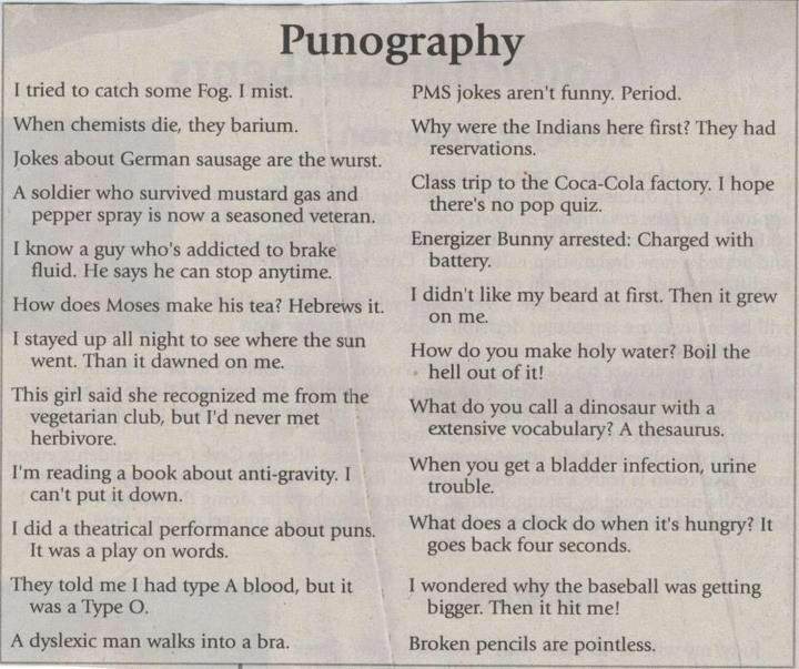 Speaking as a pun-lover myself, those are all really good. Thanks. Could we get a list of Spanish ones going too, in addition to ¿Qué hace el pez? (or is that actually a pun after all? I don't know...)