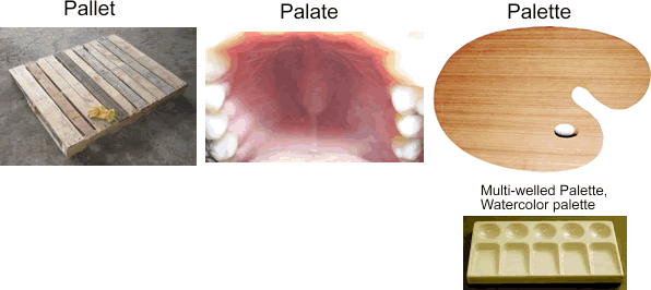 Palate (again, the same pronunciation) = paladar. Pallete se refiere tanto a la bandeja de aluminio o plástico con huecos donde un pintor mescla sus colores, como simplemente En inglés, un pintor usa un palette knife para