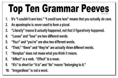 And it makes the mistake I was expecting it to make: most of those "grammar peeves" are nothing to do with grammar. It's curious how few grammar peevists actually know what grammar is.