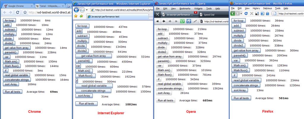 The one anomaly that piqued my interest was the array sort. 169ms in Chrome, 31ms in IE and 13ms in Firefox.