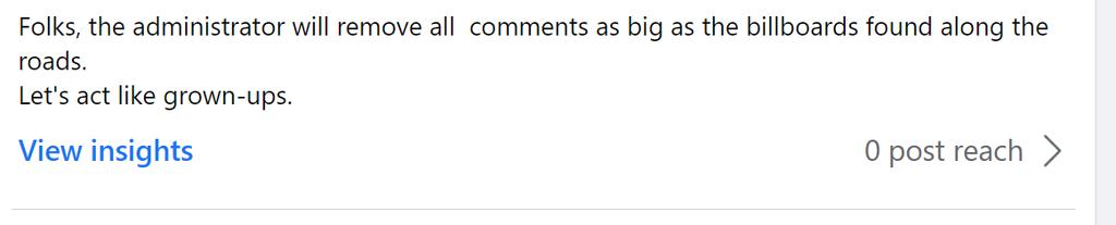 Folks, the administration will remove all billboard size comments found on the side of the roads.