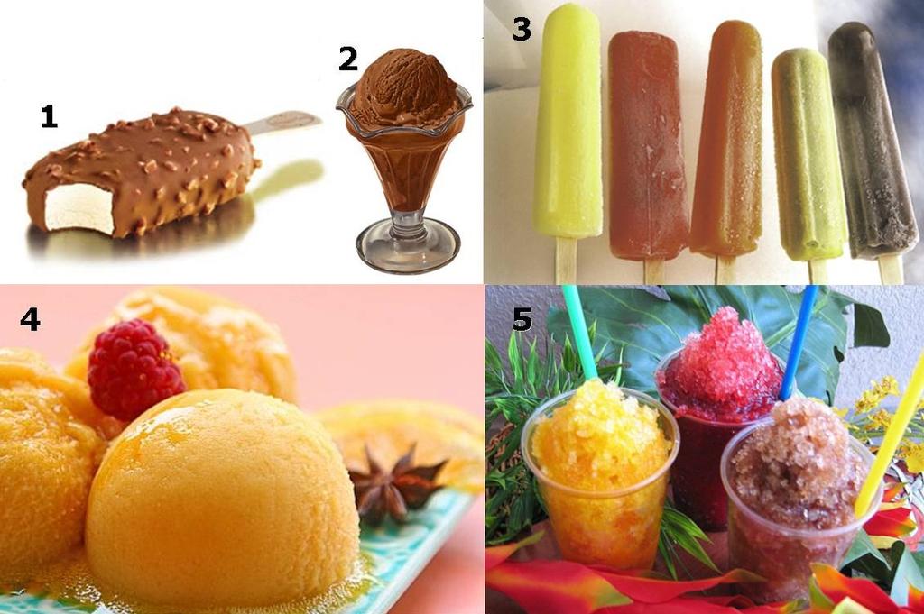 1 y 3 se llaman "paletas (de hielo)", pueden ser a base de leche o de agua.