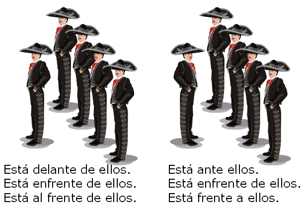 Delante de = in front of. But it can also be understood as "ahead of". Like "Contador [cyclist winner of Tour de France] está [or va] delante de ellos". en frente de or frente a = in front of /face up to (also "opposite to") /facing Also the word 'together' enfrente 1 (al otro lado de una calle, etc) opposite; vive justo enfrente = he lives just opposite, he lives just across the street; ese bloque que están construyendo ahí enfrente = that block they’re building across the road, that block they’re building over there (on the other side of the road); enfrente DE algo/alguien: queda enfrente del parque = it’s opposite the park, it’s across the road from the park; siéntate enfrente de mí = sit facing o opposite me 2 (delante) in front; enfrente DE algo in front of sth ![]()